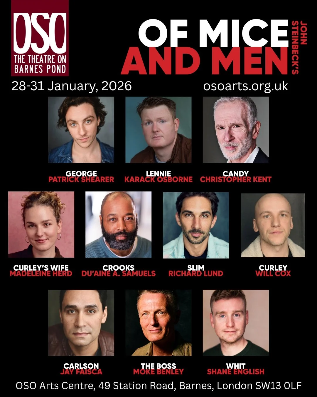 Wednesday 28th – Saturday 31st March, 7.30pm – Candy in John Steinbeck’s OF MICE AND MEN, directed by Ben Lynskey. OSO Arts Centre, 49 Station Road, Barnes, London, SW13 0LF. Tickets - www.osoarts.org.uk